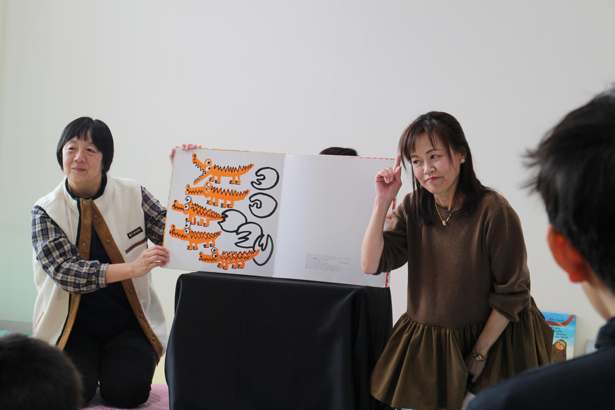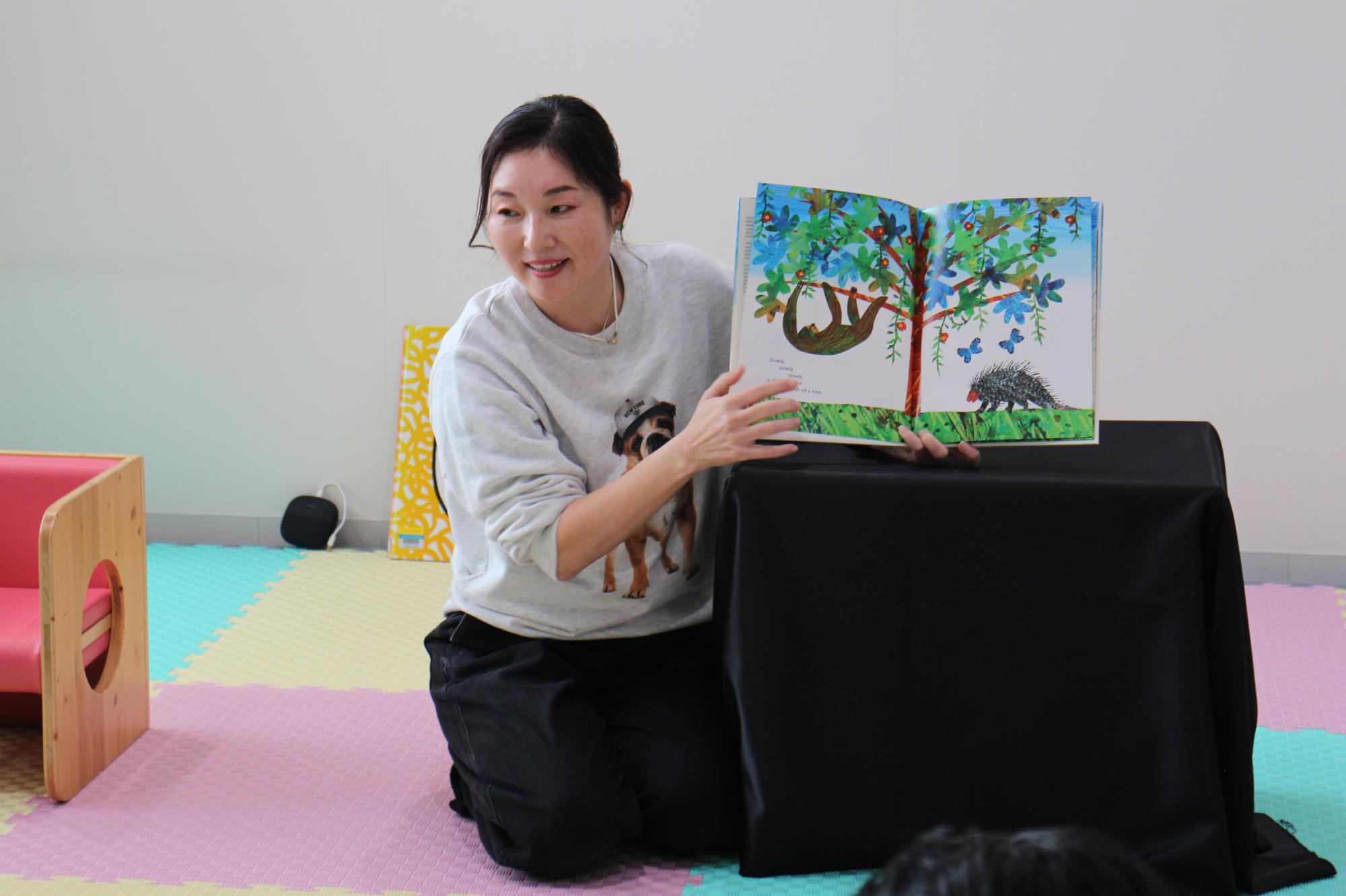 講師2名で、絵本 Egg Babies 「たまごのあかちゃん」、Bathtub in the Woods 「もりのおふろ」、"Slowly, Slowly, Slowly" said the Sloth「ゆっくりがいっぱい」を英語で読みました。